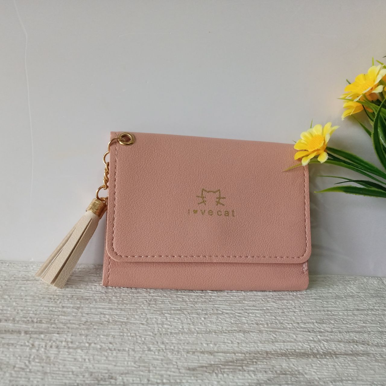 Dompet Minimalis warna pink muda ukuran panjang 11cm lebar 9cm, berbahan kulit Sintetis disertai beberapa slot untuk kartu, atau uang kertas atau koin.