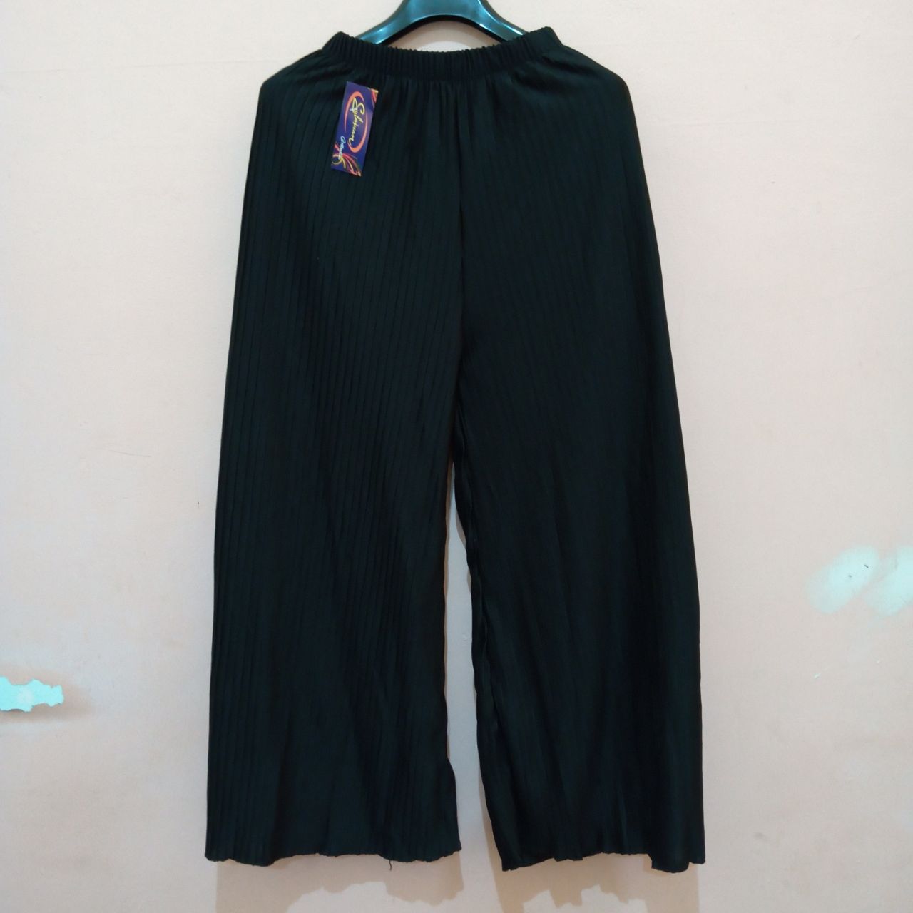 ini adalah Kulot Plisket Hitam, size: LP80cmxP87cm, material: Jersey, color: black, brand: Bajuwanitaindonesia, age_group: all ages, gender: female