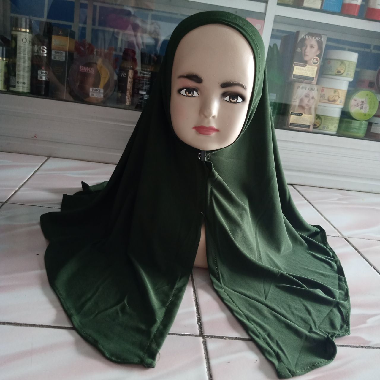 Memulai tampilan muslimah sejak kecil kenapa enggak, Kerudung instant warna hijau army berbahan jersey, akan membantu penampilan fashion si kecil menjadi lebih cantik dan anggun,