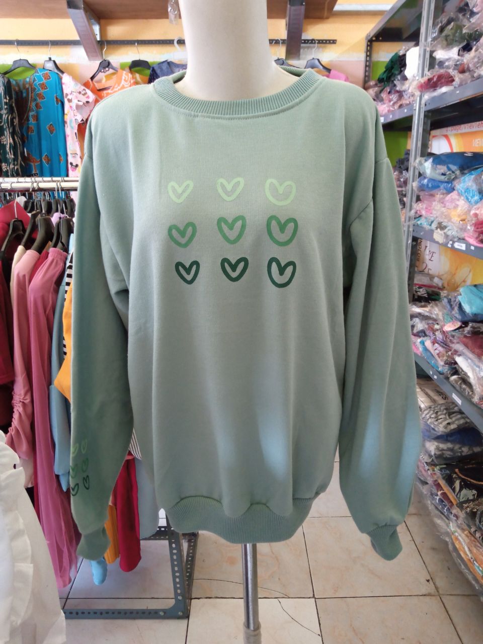 Sweater yang satu ini berbahan fleece dengan warna hijau mint yang kalem, dan berukuran LD 90cm serta Panjang baju 66cm, pas banget untuk menemani berbagai aktifitas santai, traveling atau ootd, Selain itu dia disertai sablon kartun love atau cinta pada area depan, buat kamu yang mau couple-an dengan pasangan atau teman-teman nya juga bisa.